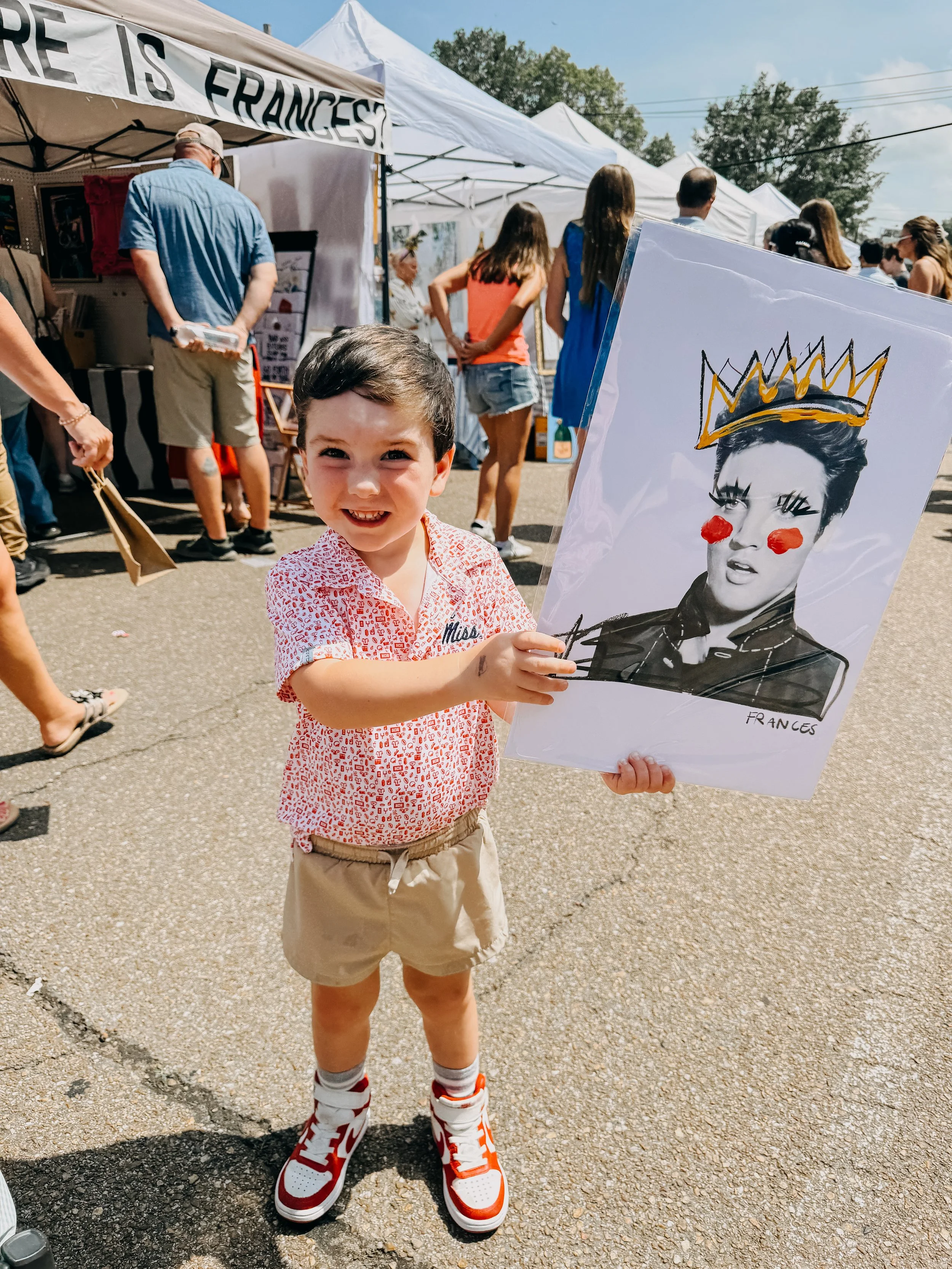 We already had a chair rail in the space, so we picked a coordinating white paint for under the chair rail, which balances the paper pattern really nicely. We also had the light fixture replaced with this brass trimmed globe and I found a fun scalloped jute Birch Lane carpet to complete the space. We kept the same art we had had before (can’t move Elvis, who Adam picked out at Where is Frances’ tent at Double Decker this spring). I couldn’t love the result more! It’s the perfect, vibrant and fun welcome to our home.